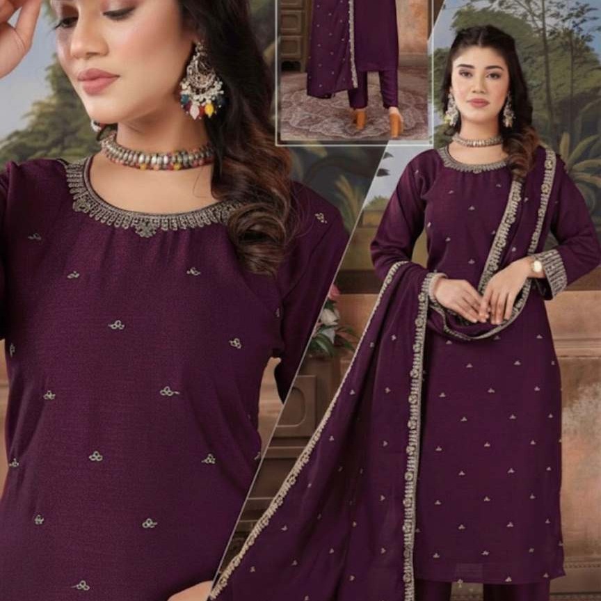 Graceful deep plum salwar suit adorned with delicate all-over motifs and a beautifully detailed neckline, paired with matching pants and an elegant embellished dupatta. A timeless choice for festive gatherings and elegant evenings. 💜